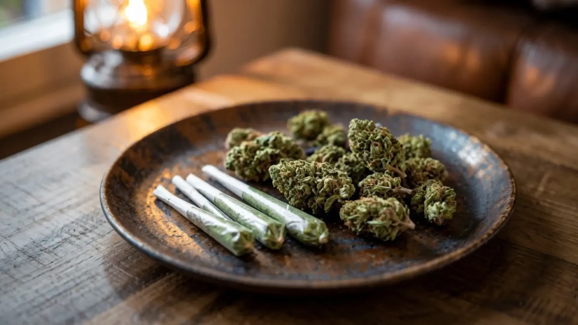 close-up of cannabis buds and rolled joints on a rustic plate set on a wooden table with a warm lantern background