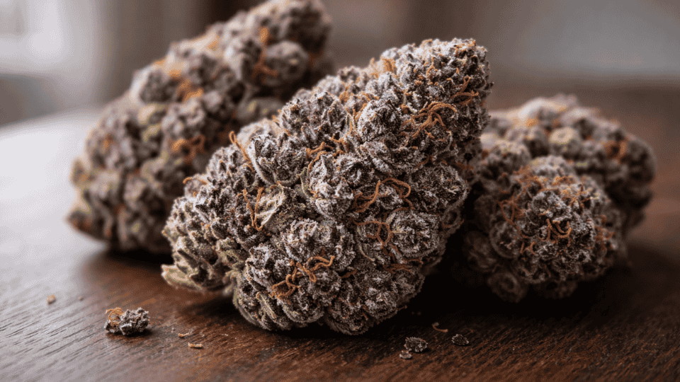 dense purple cannabis buds covered in frosty trichomes under soft studio lighting close up shot