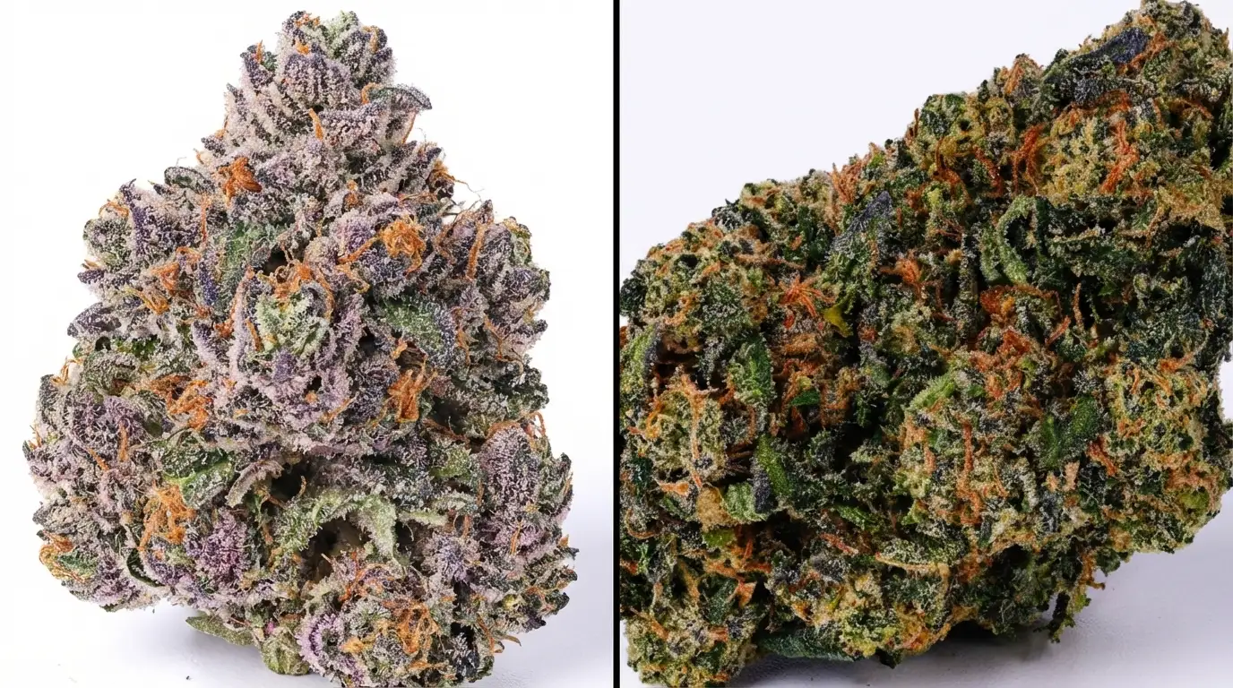 two cannabis buds side by side, one with purple hues and the other with green, both covered in trichomes